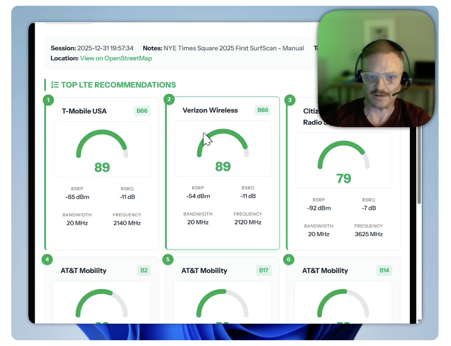 Times Square, New Year's Eve 2025. Three carriers, same location, very different capacity.